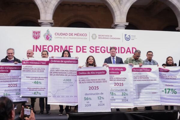 La Ciudad de México cerró 2025 como el año con menos delitos de alto impacto desde 2012, con reducciones históricas en homicidio doloso y feminicidio, lo que permite a la capital iniciar 2026 con un escenario de mayor seguridad rumbo a la Copa Mundial de la FIFA, aseguró la Jefa de Gobierno, Clara Brugada Molina.